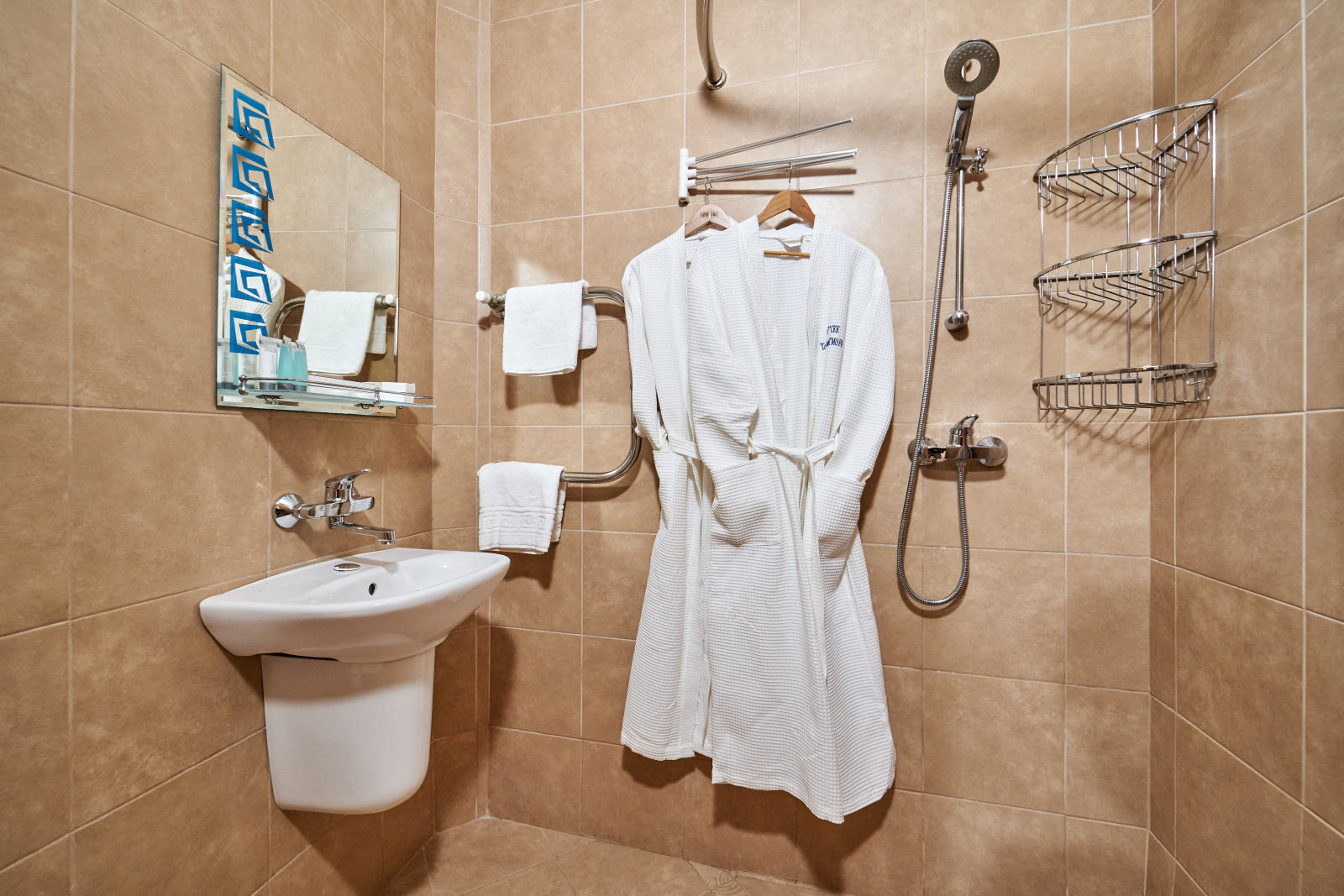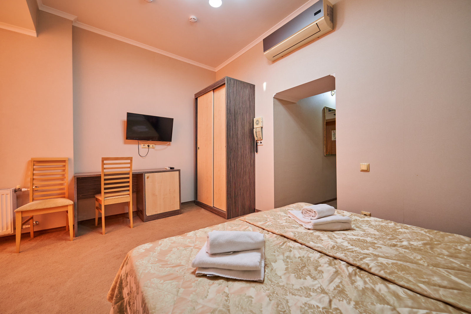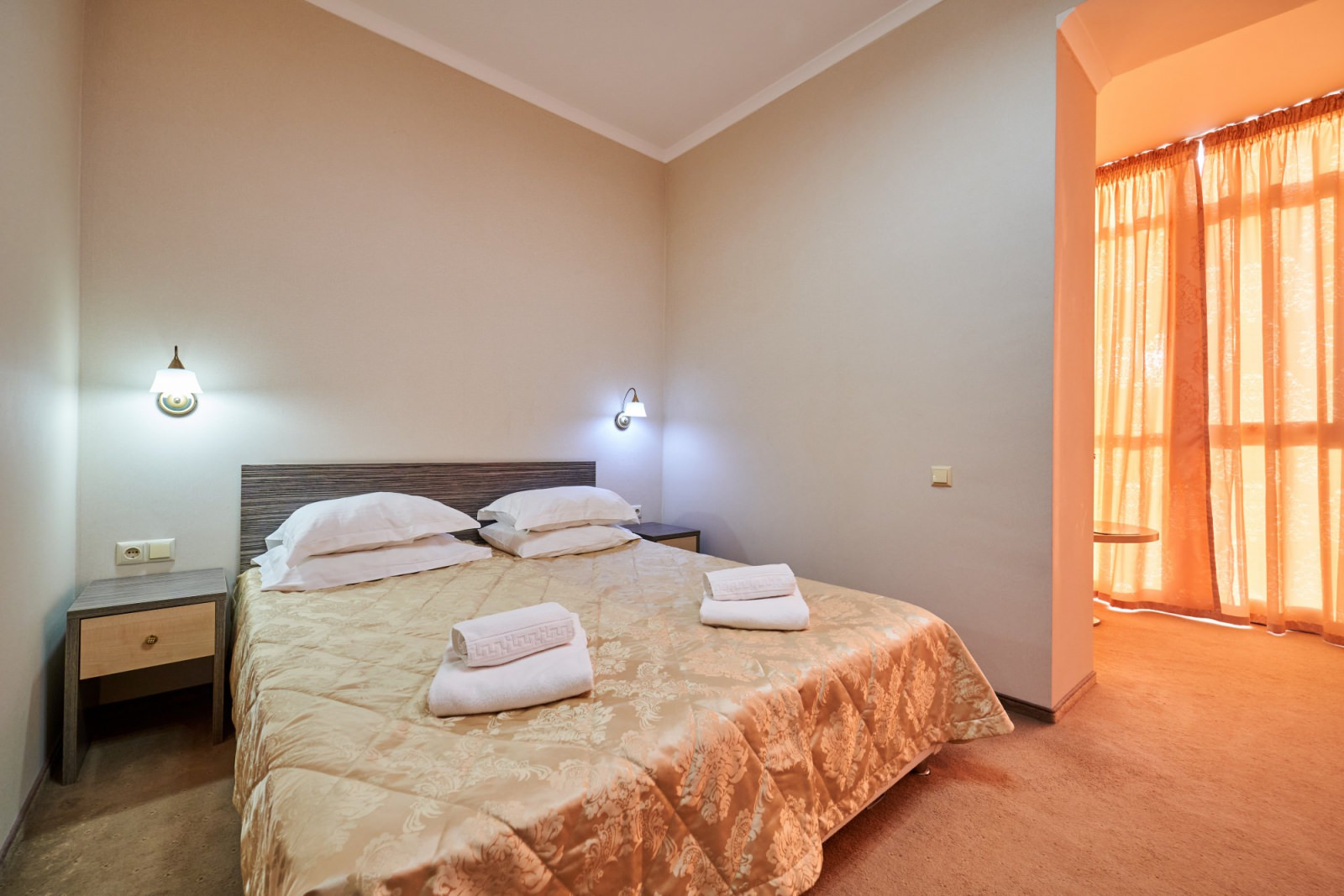 Площадь номера - 17 кв.м. 2 осн. места. 1 доп. место. Мебель: зеркало, кровать двуспальная, прикроватные тумбочки, стол, стулья, шкаф. Оборудование: кондиционер, набор посуды, телевизор, холодильник. Санузел: с душем, туалетные принадлежности. Сервис: смена полотенец (1 раз в 3 дня), смена постельного белья (1 раз в 3 дня), уборка номера (1 раз в 3 дня).